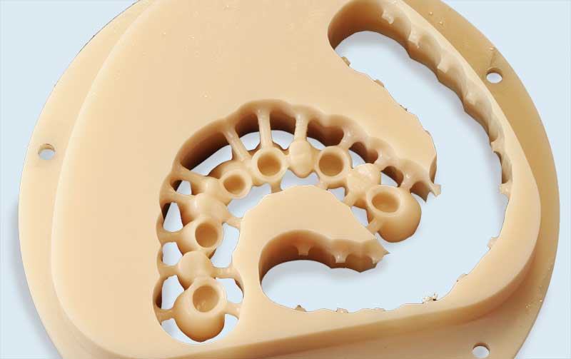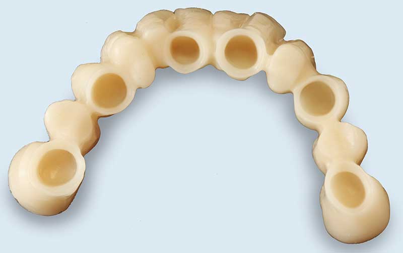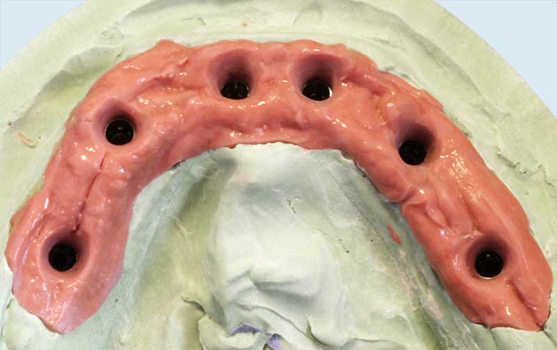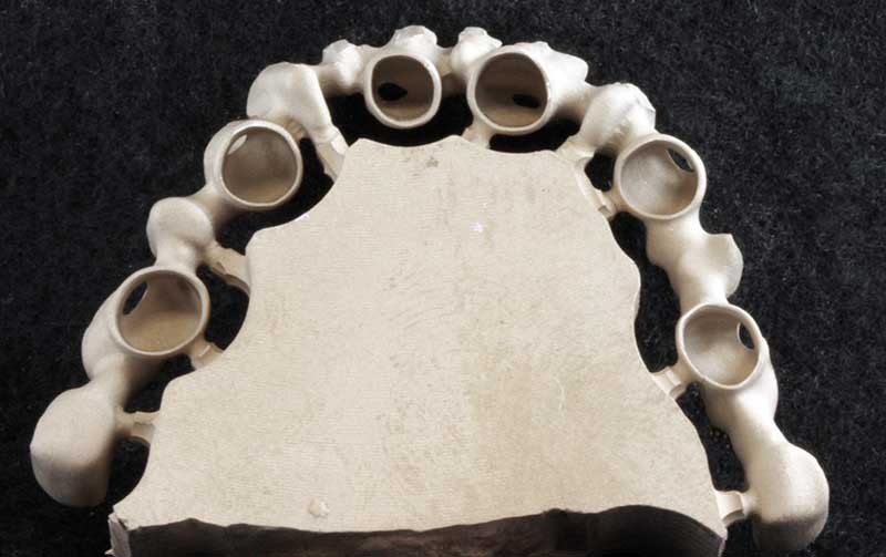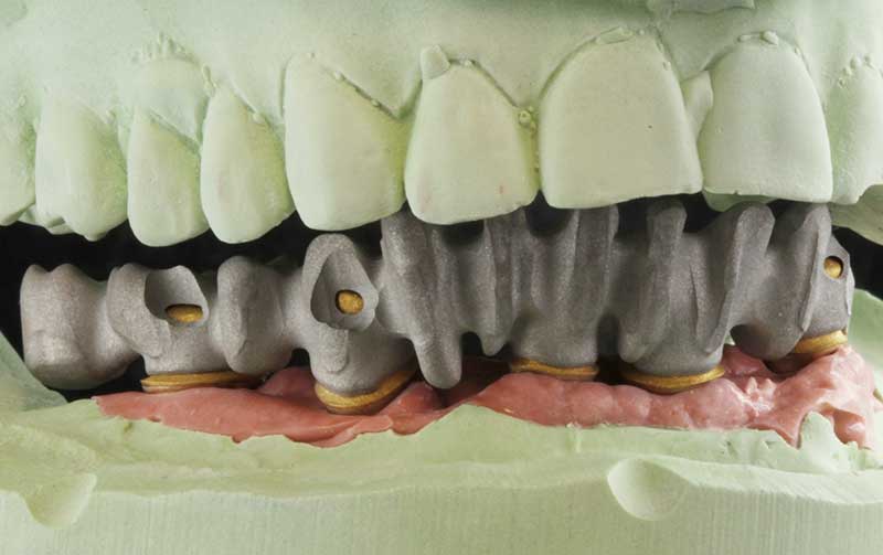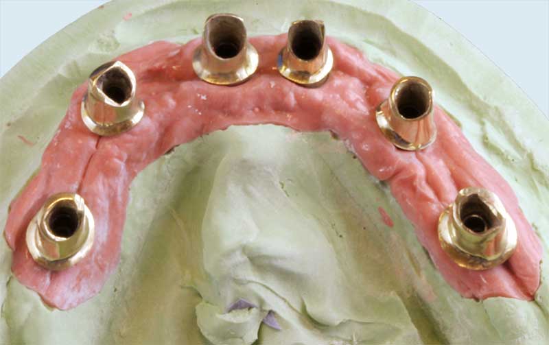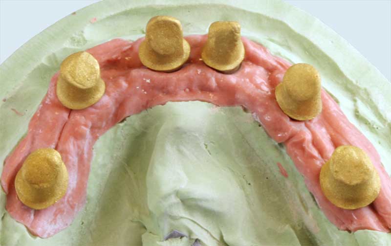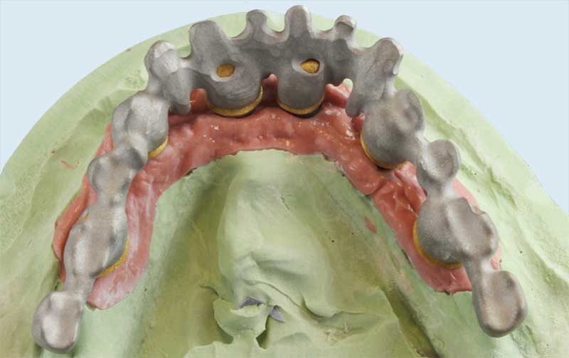 Wir empfehlen (im folgenden Fall dokumentiert) den Einsatz der Galvanotechnik. Ein ca. 0,3 mm dünnes Käppchen aus Feingold (99,9%) wird als Puffer zwischen Primärkrone und Sekundärteil konstruiert. Vorteile: perfekte Passung, geringes Gewicht, leichtes Herausnehmen, sehr guter Halt der Arbeit im Mund.